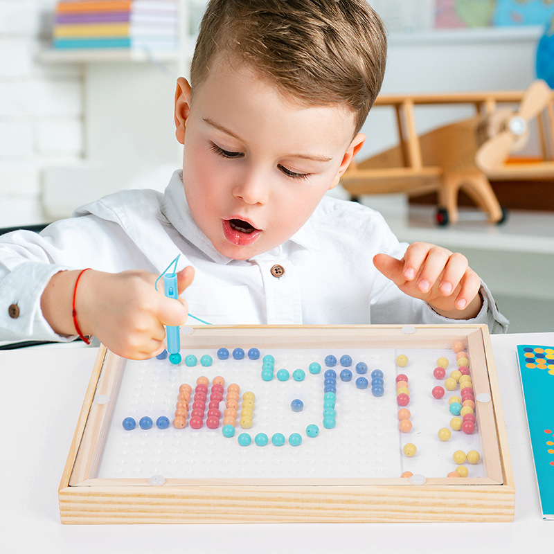 The child tries to rearrange the beads by pulling them with a magnetic pen to form various drawings, letters and numbers.