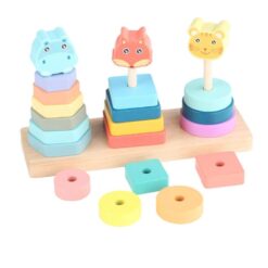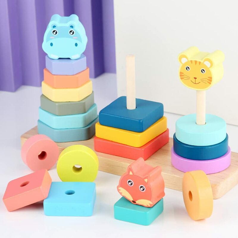 -مجموعة من القطع الخشبية بألوان و أحجام مختلفة مربعة أو دائرية أو خماسية مع وجه حيوان لطيف